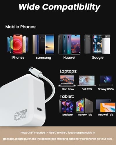 【SPECIFICATIONS】- Samsung laptop charger type c; Input Voltage: Worldwide 100-240V, 50 - 60Hz. Output Voltage: 5V~3A / 9V~3A / 12V~5A / 15V~4.33A / 20V~3.25A; Connector Size:USBC(Type-C) port,Watt:65W 45W; Compatible samsung computer charger within 65 watt. If you are not sure your laptop tip size, Please send your laptop brand and model number to us before buying; 【LATEST GAN III TECHNOLOGY】- Samsung Galaxy Book charger with GaN (Gallium Nitride) technology, charging efficiency up to 90%, chromebook laptop Gan charger is smaller in size and maximises charging speed, 60% smaller than other 65W/45W USB C chargers, perfect for charging your laptop, mobile phone or tablet while travelling. 【COMPATIBILITY】- Samsung laptop charger Fit for Galaxy Book Pro 360 15.6"NP950QDB-KB2US NP950QDB-KA2US NP950QDB-KB1US NP950QDB-KA1US Galaxy Book Pro 360 13.3 NP930QDB-KE2US NP930QDB-KD1US NP935QDC-KE1US NP930QDB-KE1US NP950QDB-KA3US NP950QDB-KB4US NP930QDB-KE4US Galaxy Book Pro 15.6" NP950XDB-KB2US NP950XDB-KA2US NP950XDB-KB1US NP950XDB-KA1US Galaxy Book Pro 13.3 NP930XDB-KE2US NP930XDB-KD2US NP930XDB-KE1US NP930XDB-KD1US Laptop Charger Type c 【COMPATIBILITY】- Samsung chromebook charger for Samsung Chromebook 4: XE310XBA XE310XBA-K01US XE310XBA-K02US XE310XBA-K03US XE310XBA-K012 XE310XBA-KD1US XE310XBA-KC1US,Chromebook 4+ XE350XBA XE350XBA-K01US XE350XBA-K02US XE350XBA-K03US XE350XBA-K05US. Samsung Chromebook Pro XE510C24 XE513C24 XE513C24-K01US XE521QAB,Chromebook Plus XE513C24-K01US xe521qab-k02,Chromebook Plus V2 XE520QAB XE520QAB-K01US XE520QAB-K02US XE520QAB-K03US XE521QAB XE525QBB,Chromebook Plus LTE XE525QBB-K01US,W16-030N1 【Customer Service】- UL-/FCC-/ROHS-Certified for safety, 65W Samsung USB C Charger, 6ft / 1.8 m USB-C to USB-C cable, our worry-free 12-month warranty, and friendly customer service. please feel free to contact us via Q&A and email and we will be here to help you, happy shopping!
