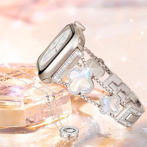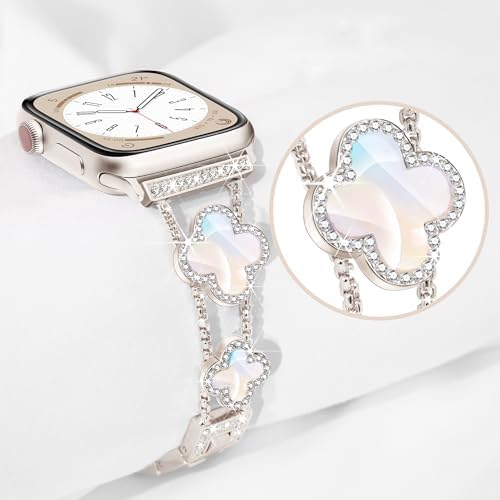 wipalor Four-Leaf Clover Band for Apple Watch Band 41mm 40mm 38mm, Lightweight for Women, Easy Adjustable Bracelet, Shiny Diamond Jewelry Metal Strap for iWatch Series 9 8 7 6 5 4 3 2 1 SE(Starlight)