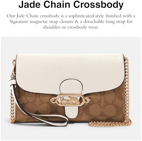 Editors Notes: Our Signature canvas and smooth leather Jade Chain Crossbody is a sophisticated style finished with a magnetic snap closure & a detachable long strap for shoulder or crossbody wear Our Signature Canvas: The best kind of mix up. This rich, mixed leather bag combines refined pebble leather with our signature canvas - for a perfectly sophisticated Coach crossbody On-the-go Essentials: This zippered small crossbody features ten credit card slots, a full-length bill compartment, inside zip pocket and a magnetic snap closure to keep essentials secure It's All in the Details: Ten credit card slots, Full-length bill compartment, Inside zip compartment, magnetic closure, fabric lining, Detachable wrist strap, Outside slip pocket, Detachable long strap with 22" drop, 8"(L) x 5"(H) x 3/4"(W)" This is COACH: Having the courage to be real since 1941. COACH is the Original American House of Leather - with a legacy of craft and a community that champions the courage to live authentically