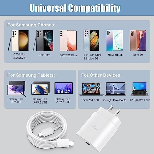 ✅【Safety Super Fast Charger USB-C】25W USB-C PD 3.0 Technology provides Max 25W output power for all Galaxy S24/S23/S22/S21/S20/Ultra/Plus/FE/Z Fold/Z Flip/Note 20/Note 10/Galaxy Tab A7/A8/S7/S8/S9,Fast Charge Your battery from zero up to 100% in about 60 min,5 times as fast as Standard Charger Block,10 times as fast as PC USB port and saves you time. ✅【Safeguard Protection】Match safety standard to advoid over-load, short current and overheat.Continuous high-power output will have a temperature rise, but they are all within the safety limits of standard certification. ✅【Super Fast Charger Compatibility】The USB C fast wall charger cable kit supports most of most of USB C devices, including Galaxy S24,S24+,S24 Ultra,S23,S23+,S23 Ultra,S23 FE,S22,S22+,S22 Ultra,S21,S21 Ultra,S21+,S21 FE,S20,S20+,S20 Ultra,S20 FE,Z Fold 2/3/4/5,Z Flip 2/3/4/5,S10,S10e,S10 Plus,S9,S9+,S8,S8+,Note 10,Note 10+,Note 20,Note 20 UltraA54,A53,A52,A51,A50,A13,A14,Google Pixel,Pixel 2,Pixel 3,Pixel 4,Pixel 5L,Pixel 6,Pixel 7,Pixel 8,LG G7 ,LG G8,LG G6,LG G5 and more USB-C devices. ✅【6.6 Ft Type C Charger Cable Cord】6.6 feet extra length USB Type C fast charging cable,designed for fast charging and data transfer, meet different demand in your daily life. it also easy for charging on different occasion, for travel, home, car, office, etc. ✅【Package List】1-Pack PD 25W USB-C Wall Charger Block & 1-Pack 6.6FT USB-C to USB-C Fast Charging Cable.