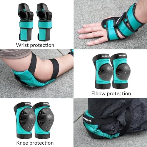 STURDY & PROTACTIVE MATERIAL Made of sturdy, soft EVA padding and tough plastic sheeting, with longer and larger pads and multiple layers of protection to ensure safety during sports and games. EASY TO CARRY The 6-in-1 protective set includes knee pads, elbow pads, and wrist guards. The protective gear set can be carried in a mesh bag when playing sports indoors or outdoors. It can be taken anywhere due to the lightweight and convenience. TWO WAYS TO WEAR Adjustable Velcro and elastic bands provide two ways of wearing. Direct binding for strong people or for summer when wearing short sleeves and shorts.Sleeves + straps. Suitable for thin people or wear long sleeves and pants. FIT FOR MULTIPLE SPORTING The protective gear set can be used with roller skating, skateboarding, cycling, scooter and various action outdoor sports to provide you with protection. To prevent the protective gear from falling off and shifting during exercise, please make sure that each part is worn correctly. COMFORTABLE AND BREATHABLE Double-sided twill elastic is adjustable for secure comfort at the knees, elbows and wrists. And breathable fabric keeps them dry and fresh and reduces sweating during hours of skating.