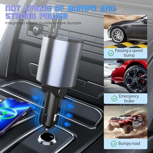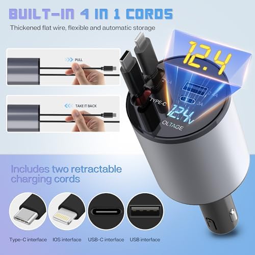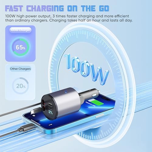 Super Fast Charger with 100W, 4 in 1 Retractable Car Charger for iPhone and Type C, Retractable Cables (31.5 inch) and 2 Charging Ports, Compatible with iPhone 15/14/13/12 Pro Max XR,iPad,Samsung