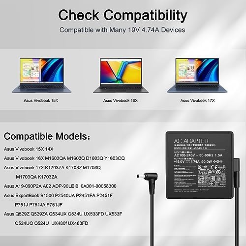 90W Charger ADP-90LE B for Asus Vivobook 15X 14X 16X 17X K1703Z M1703Q M1603Q D1603Q Y1603C Asus ExpertBook B1500 P2451F P751J Asus Q529Z Q524U Q534U UX533F UX480F