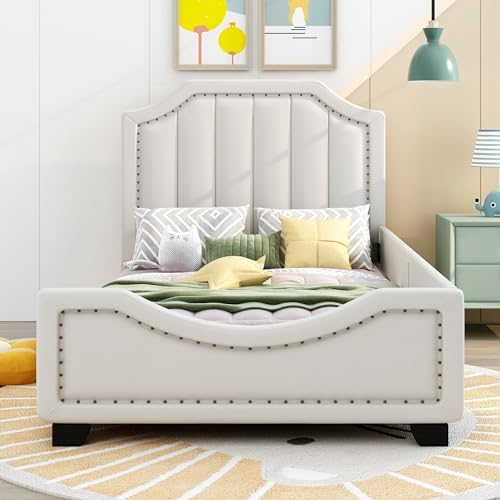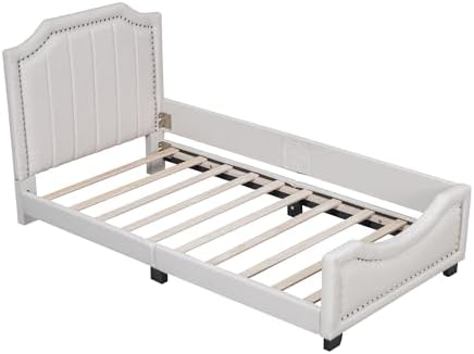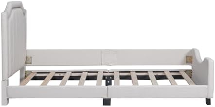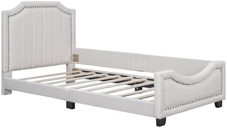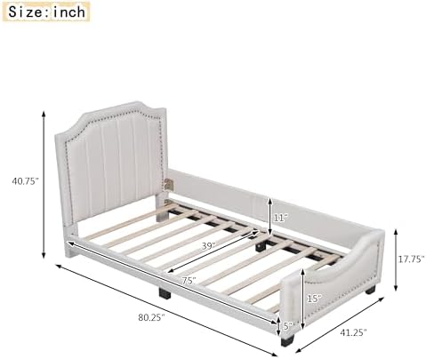 【Perfect Twin Bed for Girls/Boys】: Our twin bed frame with Nailhead trim details on headboard and footboard has simple and generous style covered by beautiful beige linen fabric which can be harmoniously matched with a variety of furniture in your home. And the twin size kids bed is suitable for many occasions such as children’s room, living room, guest room and dormitory, Add a touch of art to your home for a wide range of applications. 【Great Transition For Your Kids】: The low-profile twin size platform bed design will blend with any contemporary home decor. Perfect kids twin daybed for growing toddlers that is low to the ground to easily climb in and out on their own.; Base of bed is 2.75” from ground making it a short distance for tiny legs. 【Sturdy Construction】: This twin size kids bed frame features a sturdy high-quality solid wood construction for durability and strength, ensuring longevity. This twin Upholstered low bed frame for kids is a value conscious choice as it does not require a box spring or foundation. Just place your mattress on top and enjoy! 【Comfortable Experience】This twin-size Upholstered bed is equipped with thickly padded sponge and linen fabric to provide you with an excellent seating experience. At the same time, this twin daybed shows off lively color upholstery with a playful scalloped silhouette for a look both you and your little one will love. 【Twin Bed Dimensions】: 80.25''L x 41.25''W x 40.75''H. Weight limit daybed: 250 lbs. User-friendly assembly which can be completed in no time at all. You will receive 1 packages in total. If you have any questions, please do not hesitate to contact a member of our customer service team, at any time.
