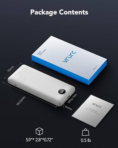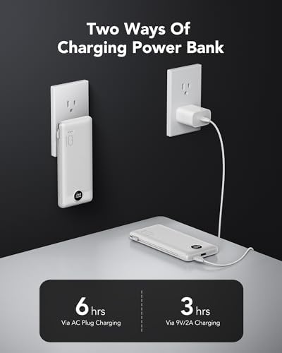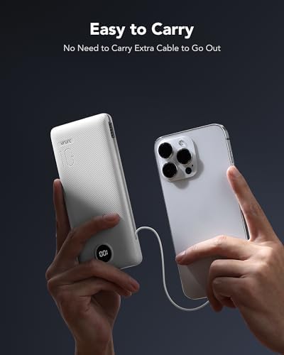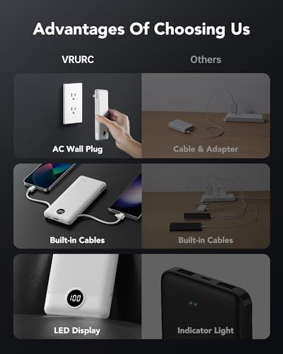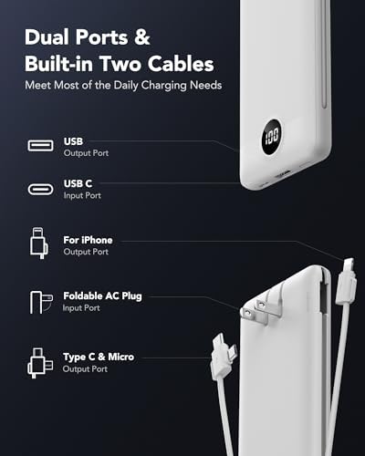 [Portable Charger With Built-in Cables & AC Wall Plug] This portable charger not only features built-in Micro, USB-C, and for iPhone charging cables but also includes USB and USB-C ports for added versatility. Moreover, the portable phone charger incorporates a built-in wall plug, enabling direct charging of the power bank from a wall outlet. [Supports Up to 22.5W Fast Charging] This portable charger with cables supports 22.5W fast charging through its USB port. Additionally, it boasts built-in cables supporting PD 20W and QC 18W, ensuring efficient and rapid charging capabilities. [Slim & Compact Design] With dimensions of 5.9 x 2.8 x 0.7 inches and a weight of 8 ounces, this product's slim and compact design enhances on-the-go convenience without adding extra weight. [Smart Digital LED Display] The smart digital LED display provides a quick overview of remaining power. Additionally, the 3D texture on the surface enhances the tactile experience, offering a better 3D touch and grip to prevent slipping of the power bank and connected devices. [Wide Compatibility] Utilizing the built-in charging cables, this portable battery charger is compatible with iPhones, Android devices, and most USB-C mobile phones and smart devices, catering to a wide range of daily charging needs. This external battery power bank meets the demands of various devices. [Product Package] Each package includes 1 Power Bank and 1 User Manual, ensuring a hassle-free user experience.