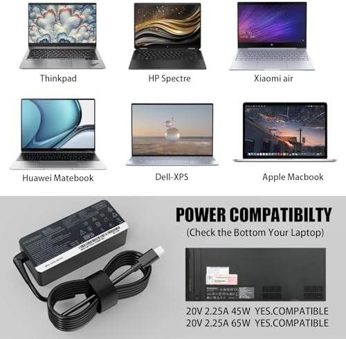 Output: 20V 3.25A/15V 3A/9V 3A/5V 3A(USB Type-C PD),Max power 65W Fast Adapter AYNEFF 65W USB-C Laptop Charger/Power Adapter has passed the rigorous tests of compliance standards. There is no need to worry about damaging the equipment Works flawlessly with USB-C Laptop Compatible with Lenovo Chromebook, Dell Chromebook, Lenovo Yoga, Lenovo ThinkPad, HP Spectre / Chromebook Series, Dell XPS 12/13", MacBook Pro/MacBook Air Comply with electrical safety laboratory inspection standards, and a number of protections against damage to equipment, which can prevent overcharging, overcurrent and overheating (Package Contents) AYNEFF A1749 65W USB-C Charger, with 3.3ft AC cord, user Manual