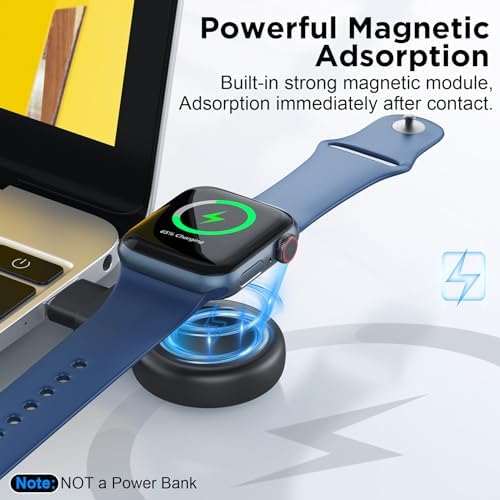 【Widely Compatibility】This upgraded charger designed for Apple Watch (model: Ultra2 Ultra SE2 SE Series 9 8 7 6 5 4 3 2 1, sizes: 49mm 45mm 44mm 42mm 41mm 40mm 38mm) , ensuring convenient charging for all Apple Watch users (ATTENTION: This battery charger is NOT a power bank). 【Two-Way Type Universal】Built-in USB-C interface and equipped with USB-A adapter dual-port design, suitable for almost all types of power ports in daily life, you can plug the charger into power bank/laptop/wall adapter/car or other devices with USB-A or USB-C charging ports to charge the watch. 【Cable-Free & Portable】No more messy cables, saving you from the hassle of winding cables! The compact & lightweight design is slip into pocket or bag easily and convenient to carry around. Perfect ideal for using at home, office, business trips, camping, travels and more daily use scenarios. 【Powerful Magnetic Adsorption】The watch can be adsorption when it touches the charger. The strong magnetism ensures the watch stays in the center of the charger and secures the watch from sliding off, provide a stable charging environment for your Apple Watch. 【Fast & Safe Charging】This portable charger for Apple Watch offers high speed battery charging experience just like original charger, which can fully charged your watch only takes 2~3 hours. And the safety features such as over-current, over-voltage, short-circuit and over-temperature protection protect your iWatch from damage caused by abnormal charging.