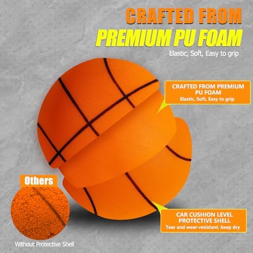 【Dribble Dream Silent Basketball】The silent basketball dribbling indoor introduces a unique foaming technology that ensures a completely silent playing experience, making it perfect for sensitive indoor environments. This technology can also enhance elasticity, but the bouncing ability of this kind of basketball will be slightly lower than that of a real rubber basketball, reaching 90% of the elasticity of a rubber basketball. 【High quality 】Our silent basketball is made of high quality foam, which is comfortable, super soft, easy to grip, and won't damage your furniture when playing. And there is no need for extra inflation, no need to worry about air leakage. 【Lightweight and Noiseless】Hush handle silent foam ball has countless tiny holes to absorb the sound caused, the sound in in the ball body gradually disappeared, play the role of silent, silent ball is very light, in the movement will not really knock over things, and will not cause any injury. 【Indoor Basketball Activities】Perfect for training, practice, and recreational games, this easy-to-grip handleshh silent basketball provides a safe and enjoyable experience. You can enjoy a peaceful game of basketball with this silent indoor basketball. It also helps to improve overall basketball skills. 【Perfect Gift】If you want to keep your kids away from computer and phone games and get them playing sports more, but are afraid they are making too much noise or getting injured while playing sports,without a doubt, Silent Basketball Dribbling Indoor is your best gift choice.