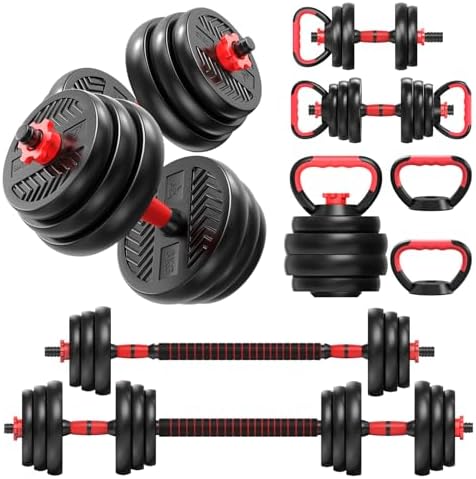 ▶【Versatile Training Equipment】: 4 in 1 adjustable dumbbell set can elevate your home workouts. Ingeniously designed to convert into dumbbells, barbells, kettlebells, and push-up stands, it's the ultimate versatile equipment for a wide array of strength exercises. ▶【Innovative Design】: The unique plates prevent rolling, enhancing safety and allowing for seamless transitions between exercises. This design ensures your workout space is efficient, and your routine is uninterrupted. ▶【Premium Quality & Durability】: Crafted with eco-friendly PE material and a robust cement and iron sand mixture, the 4 in 1 adjustable weight dumbbell set promises durability and precise weight for a focused workout session every time. ▶【Ergonomic Comfort & Secure Grip】: The dumbbells adjustable weight set is designed for a non-slip, secure grip and comfort that adapts to the natural contours of your hands and neck because of it's an ergonomic, foam-padded bar and upgraded anti-loosing nuts design. ▶【Adjustable Weight for Progressives Training】: It is great for diverse exercises and progressives training, ensuring your fitness evolves. Cater to your fitness level with our adjustable weights, dumbbell: 5-44lbs, barbell: 5-88lbs, kettlebell: 2.5-26lbs.